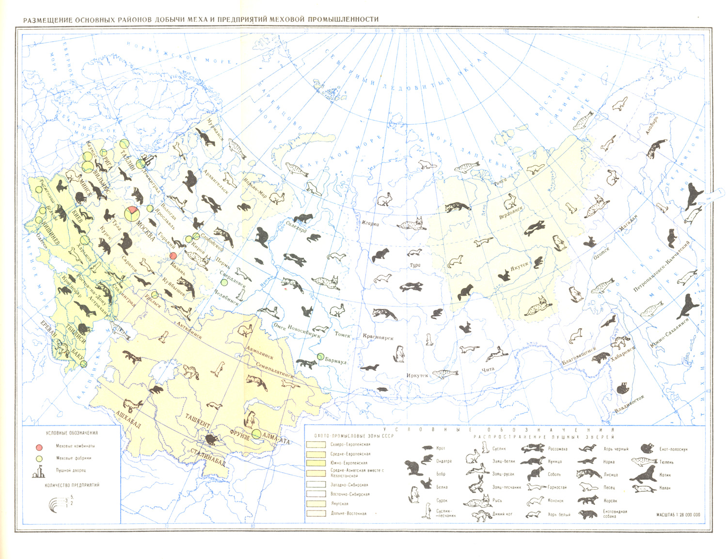 На карте обозначены охотничьепромысловые зоны СССР и размещение мехообрабатывающей промыленности.