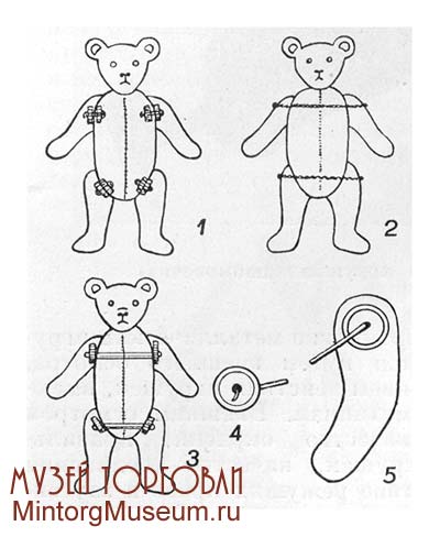 Мягкая игрушка на шарнирах: 1 — двукратное внутреннее проволочное крепление; 2 — верёвочное сквозное наружное крепление; 3 — одношарнирное сквозное внутреннее проволочное крепление; 4 — шарнир — фанерный кружок с проволокой; 5 — шарнирное внутреннее крепление