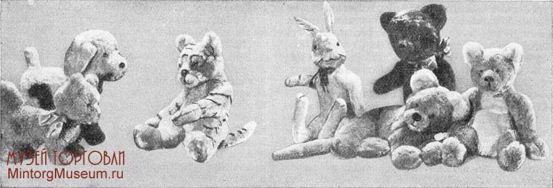 Одной из любимых детьми мягких игрушек являются медвежата (мишки), особенно шарнирные из плюша, озвученные. В СССР выпускались следующие мишки: северный — стоящий, бурый — с подвижными конечностями и поворачивающейся головой, медвежонок озвученный, медведь на подставке с колёсами и мишки, одетые в разные костюмы и многие другие. Очень богат был ассортимент собачек, кошек, зайцев, в т. ч. одетых и озвученных собачек различных пород в различных позах: стоящих на задних лапах, с вертящейся головкой и подвижными конечностями, бегущих (на подставках с колёсами); особенно распространены: плюшевый зайчик с подвижными конечностями, к спинке которого была прикреплена морковка; слоны с яркими попонами из плюша или сукна (неподвижные, шарнирные, одетые в платье); обезьянки из плюша на резинке и с кольцом, с лицами, выкроенными из ткани или штампованными. Кроме того, выпускались верблюды, ослики, лошадки, оленёнки, белки, лисы, тигрята и другие животные разных размеров.