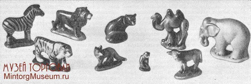 Фигурки домашних и диких животных вырабатывались из технического фарфора и включали комплекты: медвежат, волчат, лисят, белочек и др. К этим комплектам прилагались на разрисованных пластинках деревья и набор грибов разных пород. Деревья и грибы давали возможность детям реально воссоздать картину леса. Набор «зоопарк» из глины состоял из девяти зверей: слона, верблюда, зебры, тигра, льва, медведя, лисы, волка, обезьяны. Самая маленькая из этих фигурок (обезьянка) имеет высоту 25 мм, самая большая (слон) — 71 мм. Набор «птичник» состоит из фигуры птичницы и разных птиц — петуха, курицы, утки, гуся, индюшки и т. п. Размеры птиц колеблются от 3 до 5 см, фигура птичницы — 12—15 см. Набор «домашнее животное» из глины или технического фарфора состоит из лошади с жеребёнком, коровы с телёнком, козы с козлёнком и т. д. Высота фигурок от 3 до 10 см.