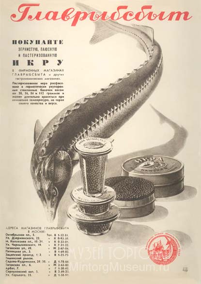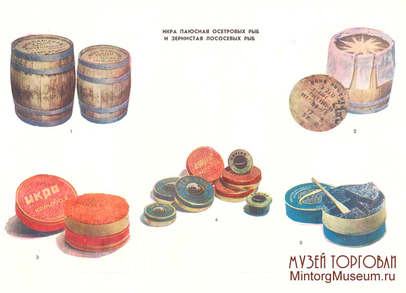 1. Бочки с паюсной икрой ёмкостью 30 и 50 литров; 2. Открытая бочка с паюсной икрой. Пергамент отвёрнут и видна веерообразная заделка полотна; 3. Икра кетовая в жестяной банке; 4. Икра пастеризованная, расфасованная мелкую тару; 5. Икра паюсная в жестяной банке.