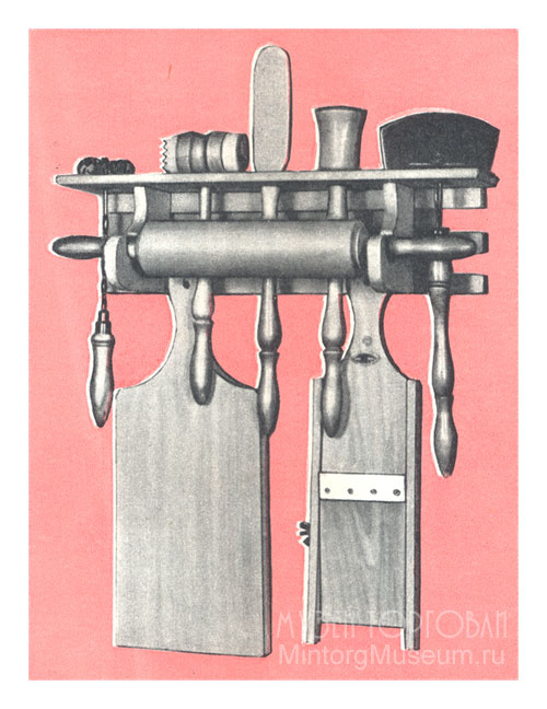 Кухонные машинки и приспособления: картофелемялки, картофелечистки, лопатки буфетные и кухонные (рыбные, блинные и др.), маслобойки, мельницы для кофе, мельницы для перца, молотки мясоотбойные, мороженицы, мясорубки, ножеточки, пресс-пюре, противни, рыбочистки, сечки, сита, скалки, сковородники, соковыжималки, солонки, молокосторожа, тёрки, толкуши, ухваты, формы кухонные (для пудингов, печенья и др.), хлеборезки (ломтерезки), шумовки, шприцы кондитерские, вишнечистки, яйцерезки.