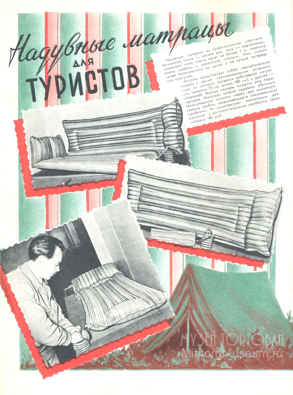 Надувные матрацы (матрасы) из прорезиненной хлопчато-бумажной ткани — сатина или тика — были портативны, занимали мало места, весили не более 2 кг (что по сегодняшним меркам не мало), и считались очень удобными в туристских походах. Ими можно было также пользоваться на дачах и во время загородных прогулок.