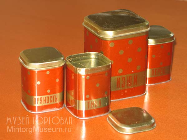 Банки имели прямоугольную форму, штамповались из белой жести и были соединены с крышкой шарнирами. Банки выпускают двух размеров: меньшие — для корицы, чая, перца, гвоздики, тмина и других специй; большие, ёмкостью примерно на 1 кг, — для круп, кофе, сахара, фасоли и др.