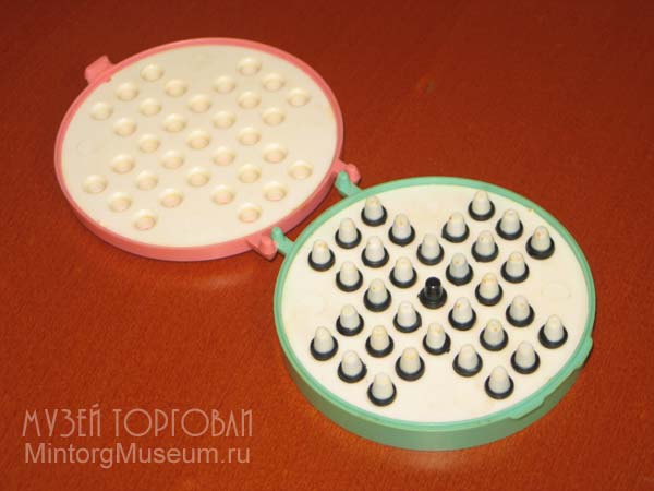 Игра для одного. Фишки расставлялись так, чтобы были запонены все гнёзда, кроме центрального. Ходить можно было только перешагивая через одну, или несколько фишек, но не по диагонали. Фишка, через которую перешагнули, считалась битой и снималась. Игра заканчивалась, когда больше нельзя было бить. Чем меньше оставалось фишек, тем лучше считался результат.