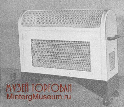 На рисунке ниже представлен электрический камин, снабжённый переключателем напряжения 127/220 в; потребляемая им мощность при напряжении 127 в составляла 1,2 квт, при 220 в — 0,9 квт. Нагревательный элемент камина представлял собой нихромовую проволоку, изолированную жаростойкой оплёткой, укрепленную на четырех керамических дисках и состоящую из двух секций. При последовательном соединении секций камин мог быть включён в сеть напряжением 220 в, при параллельном — 127 в. Нагревательный элемент был размещён в металлическом кожухе с защитной сеткой. В дне кожуха были встроены две электрические лампы и красочный экран для имитации тлеющих углей.