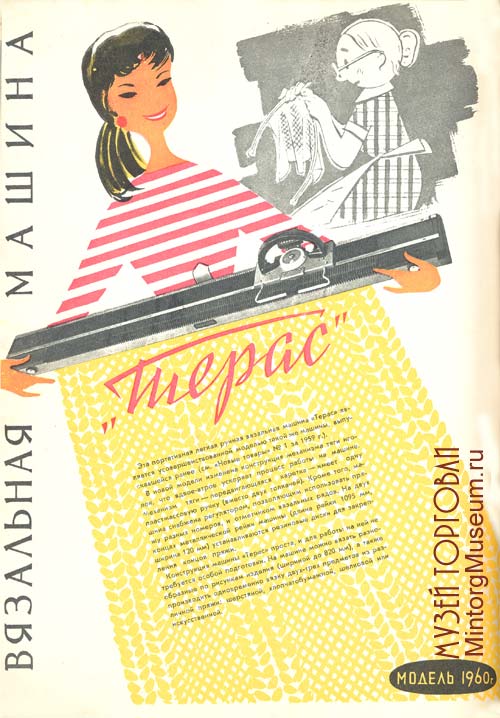Портативная лёгкая ручная вязальная машина "Терас" образца 1960 года, являлась усовершенствованной моделью такой же машины, выпускавшейся ранее. В новой конструкции была изменена конструкция тяги иголок, что в несколько раз ускоряло процесс работы на машине. Механизм тяги - передвигающаяся каретка - имела одну пластмассовую ручку (вместо двух толкачей). Кроме того машина была снабжена регулятором, позволявшим использовать пряжу разных номеров и, и отметчиком вязальных рядов. На двух концах металлической рейки машины (длина рейки 1095 мм, ширина 120 мм)устанавливались резиновые диски для закрепления концов пряжи.