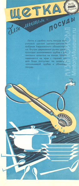Легко и удобно мыть посуду капроновой щёткой щетино-щеточной фабрики Харьковского облместпрома. Внутри деревянной ручки щётки проходит алюминиевая трубка с резиновым шлангом на конце. Шланг надевается на кран с горячей водой. Вода поступает по шлангу и алюминиевой трубке и обмывает посуду.