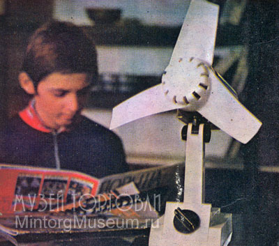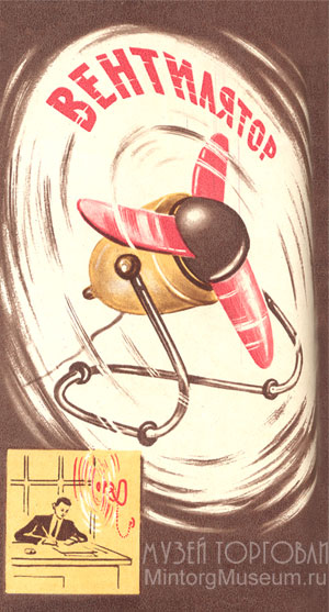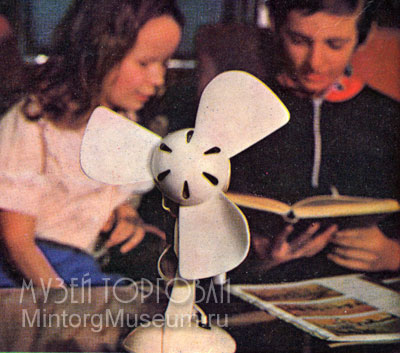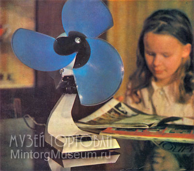 Пластмассовому корпусу настольно-настенного вентилятора (Саратовского совнархоза 1959 года) была придана обтекаемая форма. Внутри корпуса размещался короткозамкнутый электродвигатель на 127 в, мощностью 15 вт. На выступающей из корпуса части вала электродвигателя укреплялась эластичная 3-лопастная крыльчатка, которая делала 2400 об/мин (производительность вентилятора 4 м³ воздуха в минуту).
