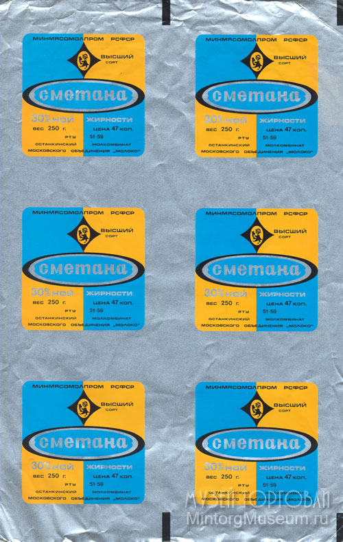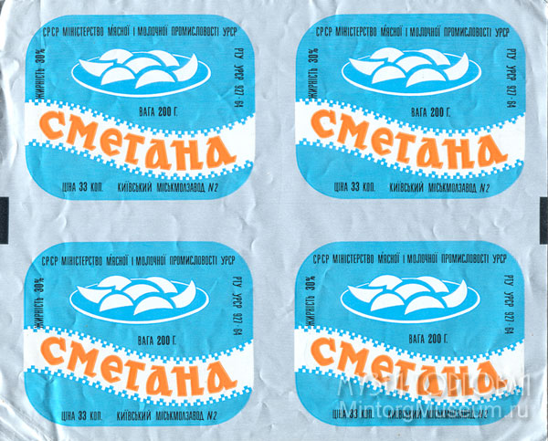 Сметана 30% жирности Минмясомолпром РСФСР Останкинский молкомбинат Московского объединения "Молоко"