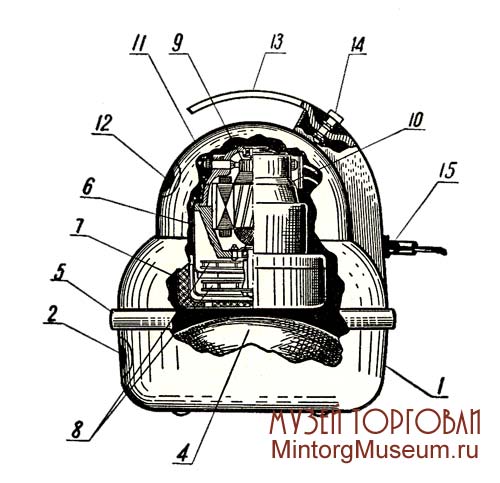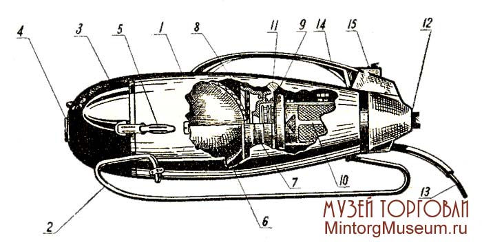 Устройство вихревого пылесоса: 1 — нижний полукорпус пылесоса — пылесборник; 2 — входное отверстие и фланец для крепления гибкого шланга; 3 — трубка с отражателем-направителем; 4 — съёмный тканевый фильтр; 5 — резиновый уплотнитель; 6 — воздушный насос; 7 — защитная проволочная сетка воздушного насоса; 8 — турбинки воздушного насоса; 9 — электродвигатель; 10— помехоподавляющее устройство; 11 — верхний полукорпус пылесоса; 12 — выходное отверстие и фланец для присоединения гибкого шланга; 13 — ручка; 14 — выключатель; 15 — соединительный шнур со штепсельной вилкой