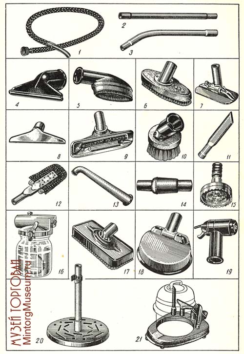 Принадлежности пылесосов: 1 — шланг соединительный гибкий; 2 — труба удлинительная прямая; 3 — труба удлинительная изогнутая; 4 — пылеуловитель овальный малый; 5 — пылеуловитель овальный малый со щёткой; 6 — щётка (пылеуловитель) овальная большая с неподвижным патрубком; 7 — пылеуловитель овальный большой с подвижным патрубком; 8 — пылеуповитель овальный большой с неподвижным патрубком; 9 — пылеуловитель большой с подвижным патрубком, однорядной щёткой, регулирующейся по высоте щёткой и подвижной гребенкой; 10 — щётка (пылеуловитель) круглая; 11 — пылеуловитель щелевой; 12 — пылеуловитель щелевой со щёткой-ершом; 13 — пылеуловитель конический изогнутый; 14 — распылитель; 15 — пылеуловитель-скребница; 16 — пульверизатор; 17 — насадка полотёрная с неповоротным патрубком; 18 — насадка полотёрная с поворотным патрубком; 19 — насадка-злектротепловентилятор; 20 — насадка стиральная; 21 — тележка для вихревых пылесосов
