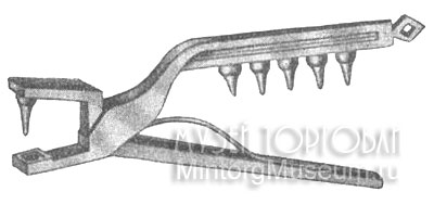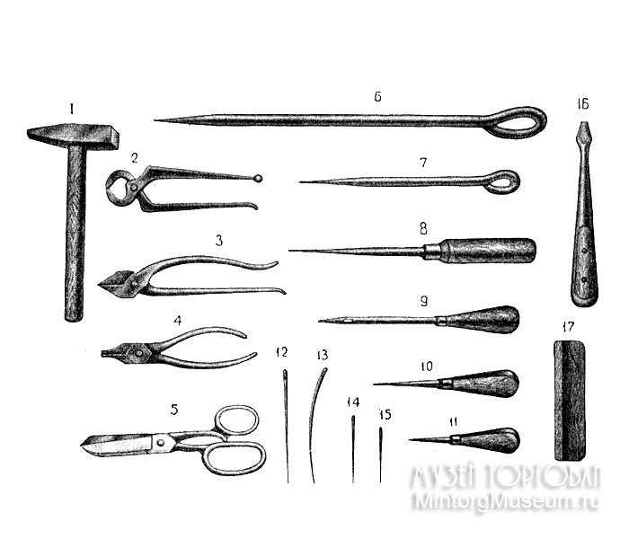 Универсальный инструмент для ремонта и погиива шорно-седельных изделий: 1 — молоток; 2 — клещи вытяжные; 3 — клещи затяжные; 4 — плоскогубцы; 5 — ножницы; 6, 7, 8 — шилья большие круглые; 9 — шило большое гранёное с отверстием; 10 — шило среднее гранёное; 11 — шило малое гранёное; 12, 13, 14, 15 — иглы стальные прямые, круглые, кривые, гранёные; 16 — отвёртка; 17 — гладилка