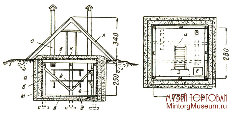 Ледник-погреб: а — стена погреба; б — изоляция стен шлаком; в — пол из досок; г — приямок; д — шлак; е — вентиляционный канал; ж — передвижные полки для продуктов; з — сток; и — лестница; к — перекрытие погреба из пластин; л — навес