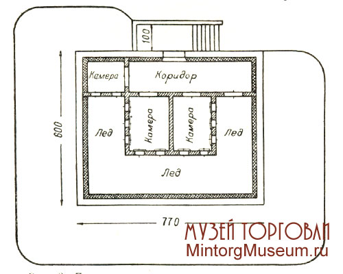 Поступая в камеру, охлаждённый воздух отеплялся и, поднимаясь вверх под напором поступающего холодного воздуха, вновь попадал в ледохранилище через верхние отверстия стенок камер. Этот процесс циркуляции воздуха происходил непрерывно. В леднике с камерами сохранялась температуpa от +1° и выше, в зависимости от площади камер, количества хранящихся товаров, продолжительности хранения и правильной циркуляции воздуха. Помещение для льда следовало располагать в леднике таким образом, чтобы не менее чем две стены каждой камеры хранения имели непосредственное соприкосновение с ледохранилищем для обеспечения необходимого температурного режима в камерах. Объём помещения для хранения льда должен был быть в 2½—3 раза больше объёма всех холодильных камер, а высота помещения для льда на 1,2—1,5 м больше высоты камер, что обеспечивало нормальную циркуляцию воздуха. Ширина ледохранилища должна была быть не менее 2 м. Стены ледника рекомендовалось строить из кирпича, шлакобетона, железобетона, рубленые или засыпные каркасные; полы — из бетона с уклоном 1:50. Уклон был необходим для обеспечения стока талой воды; для обмена воздуха в камерах устраивалась приточно-вытяжная вентиляция. Для изоляции использовались торф, опилки, костра.