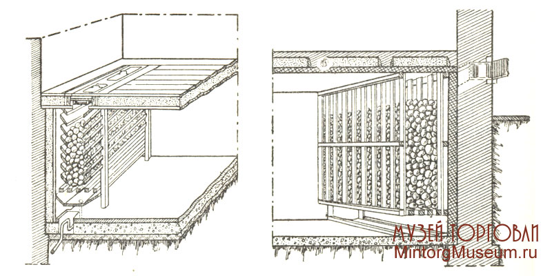 Стенки карманов делались из деревянных планок с зазором между стенками в 4 см либо типа «жалюзи» из досок, вставленных наклонно в стойки. Дно карманов устанавливались на высоте 50 см от пола. Для повышения циркуляции воздуха в камере, а следовательно, и холодоотдач перед карманами устанавливали деревянные перегородки — щиты, которые не доходили на 30—40 см до пола и потолка камеры, в середине перегородки вверху на потолке укреплялся специальный вентилятор. Под решётчатыми карманами для сбора и отвода талой воды и рассола устраивали желоба. Для загрузки карманов в перекрытии устраивались люки с двумя дверьми.