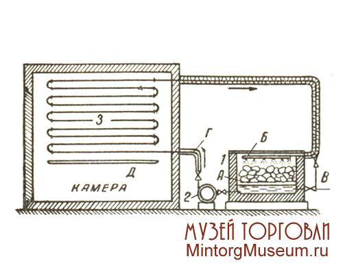 Схема фригаторной установки: 1 - генератор холода; 2 - насос для рассола; 3 - змеевик; А - решётка; Б - ороситель; В - спуск в канализацию; Г - изоляция; Д - желоб