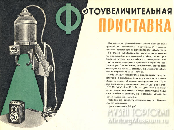 Особую группу фотоквеличителей составляли увеличительные приставки, в которых использовался корпус и объектив съемочного фотоаппарата.