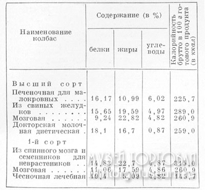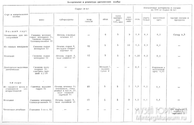 Колбасы диетические — высококалорийный питательный продукт, используется как закуска и для приготовления вторых блюд. Сырьём для изготовления колбас являлись: говядина высшего и 1-го сортов, свинина жирная, полужирная, нежирная, печень говяжья, желудки свиные, спинной и головной мозг, семенники, жиры свиные, пшеничная мука (72%-ного выхода), яйца, крахмал пищевой, лук, сахар, рис, молоко сухое, пряности и специи. По качеству колбасы делили на два сорта: высший — печёночная для малокровных, из свиных желудков, мозговая, докторская молочная диетическая; 1-й — мозговая, из спинного мозга и семенников для неврастеников, чесночная лечебная.