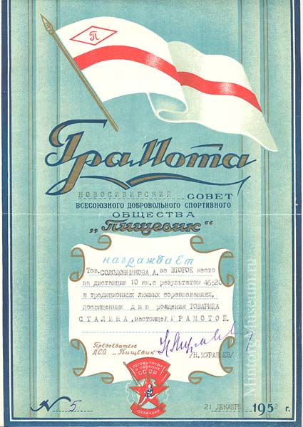 Грамота Новосибирского Совета Всесоюзного ДСО "Пищевик", 21 декабря 1952 год